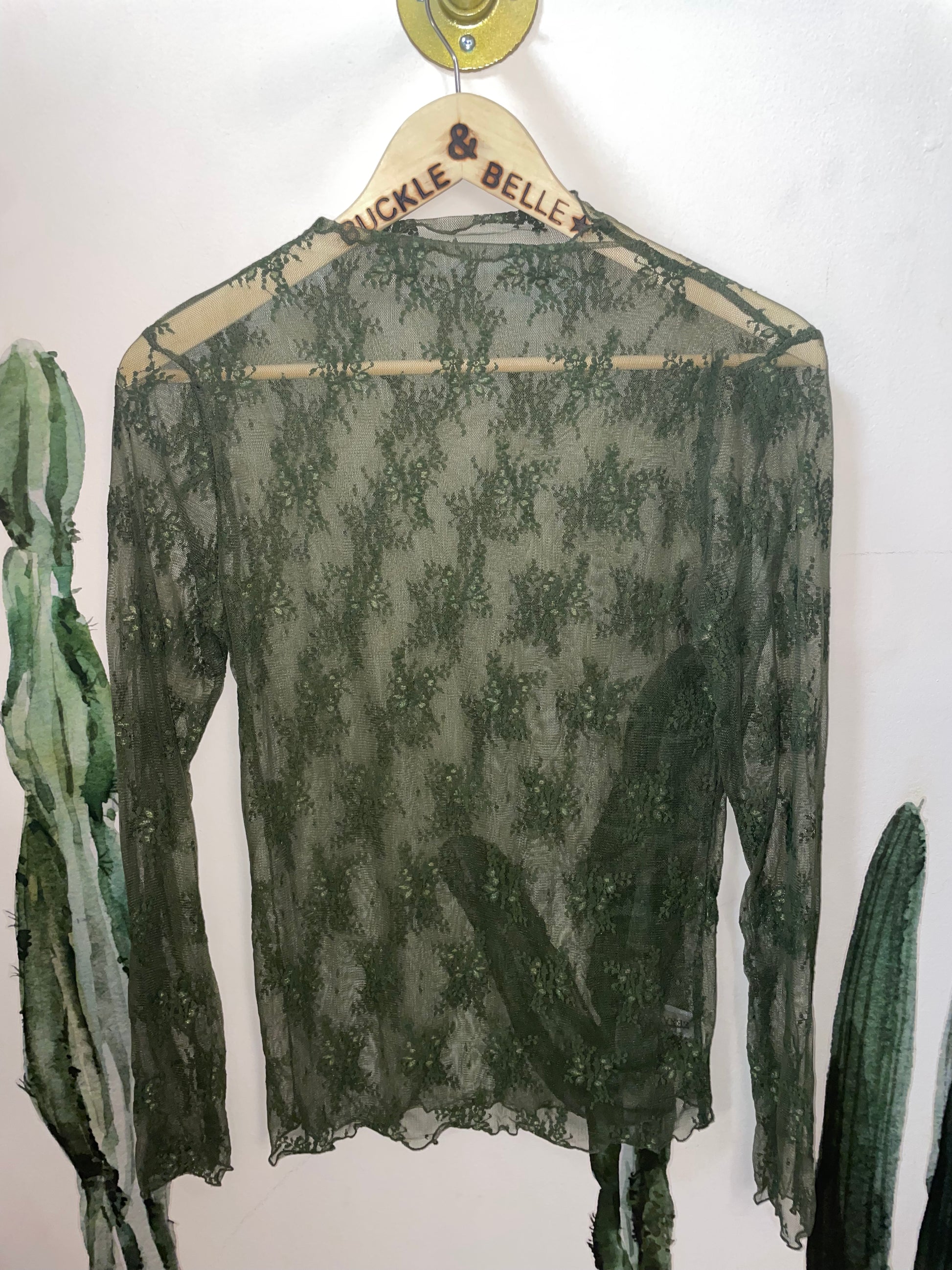 This Cowgirl Core Lace Top in Olive is a staple piece that blends fashion and functionality. Made with mesh fabric, this top is perfect for adding a touch of see-through style to any outfit. With its versatile design, it's a must-have for any modern cowgirl wardrobe.