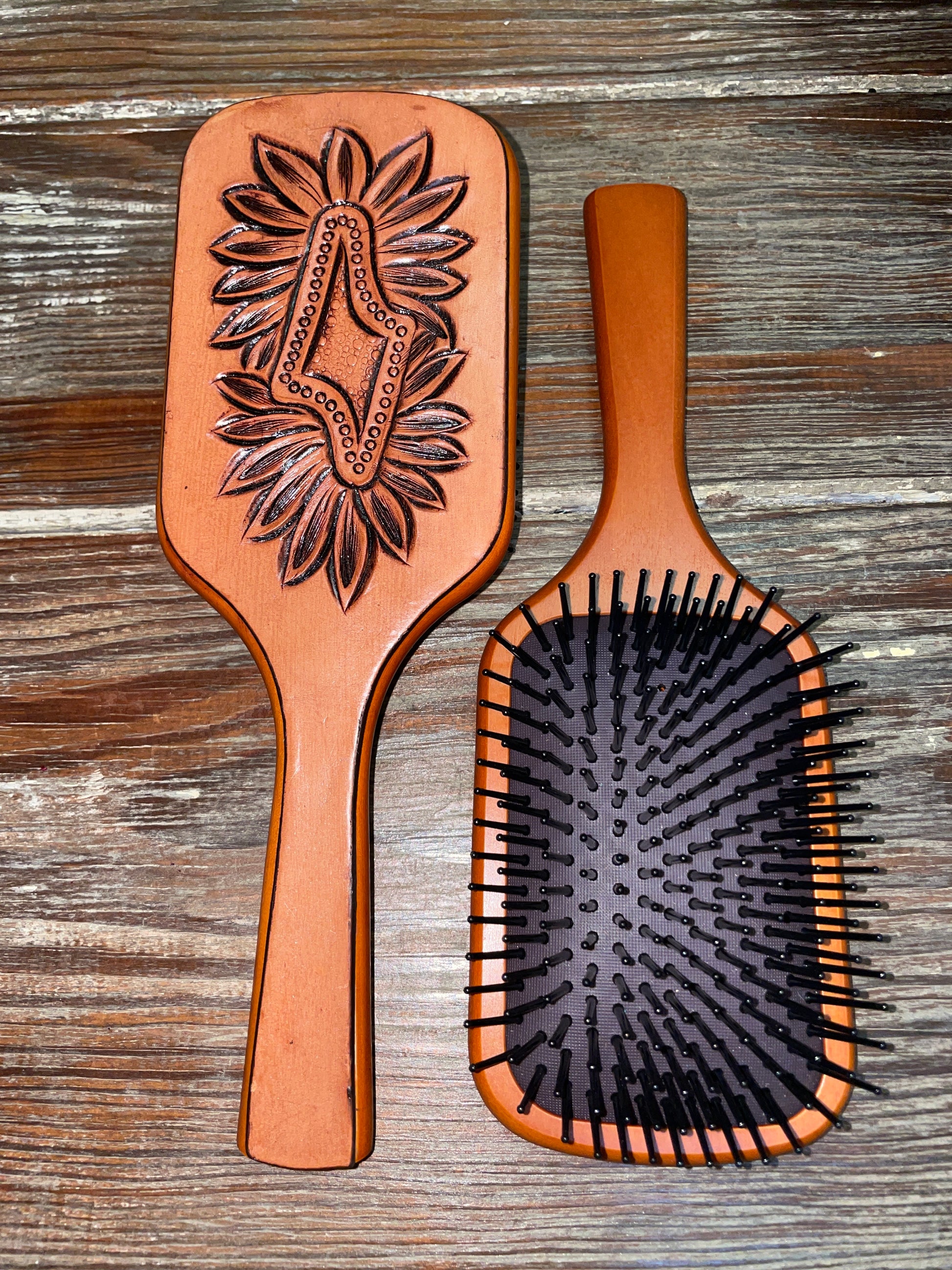 Crafted with precision and expertise, the Tooled Leather Hair Brush is the ultimate blend of style and functionality. The statement hand tooled leather adds a touch of luxury while providing a firm grip for effortless detangling. Experience the benefits of this unique combination for perfectly styled and healthy hair.